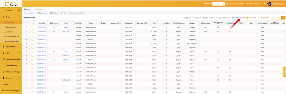 Bitte beachten: Die Angabe des Laktationstages in der Bestandliste ist bezogen auf das aktuelle Tagesdatum.